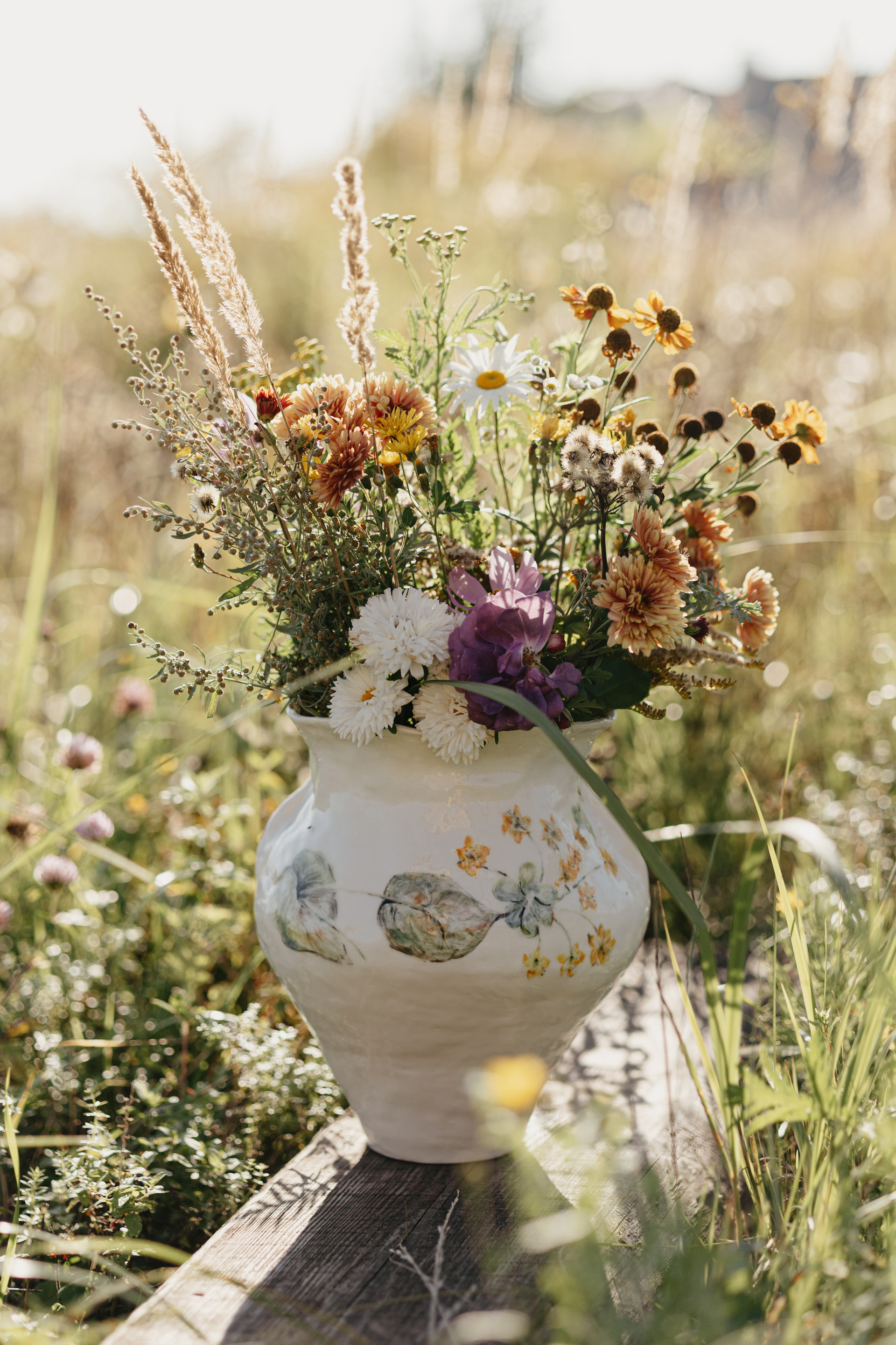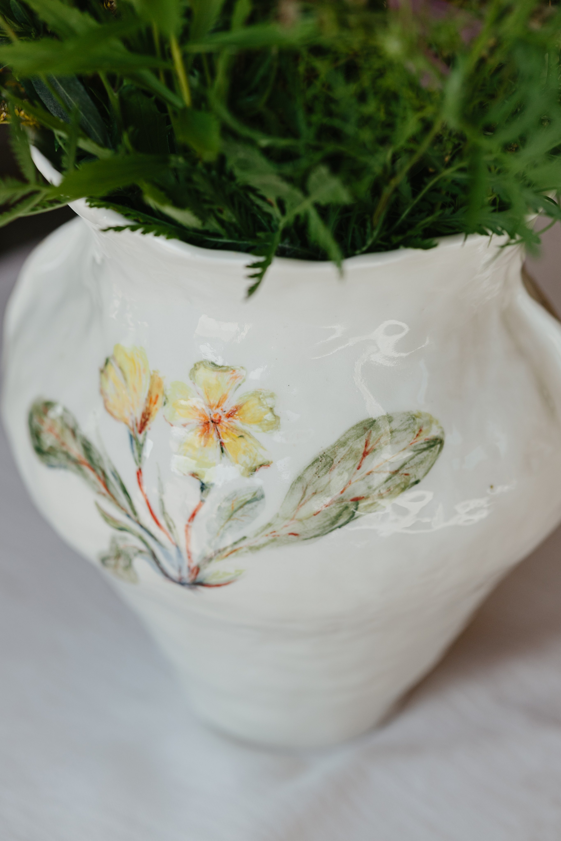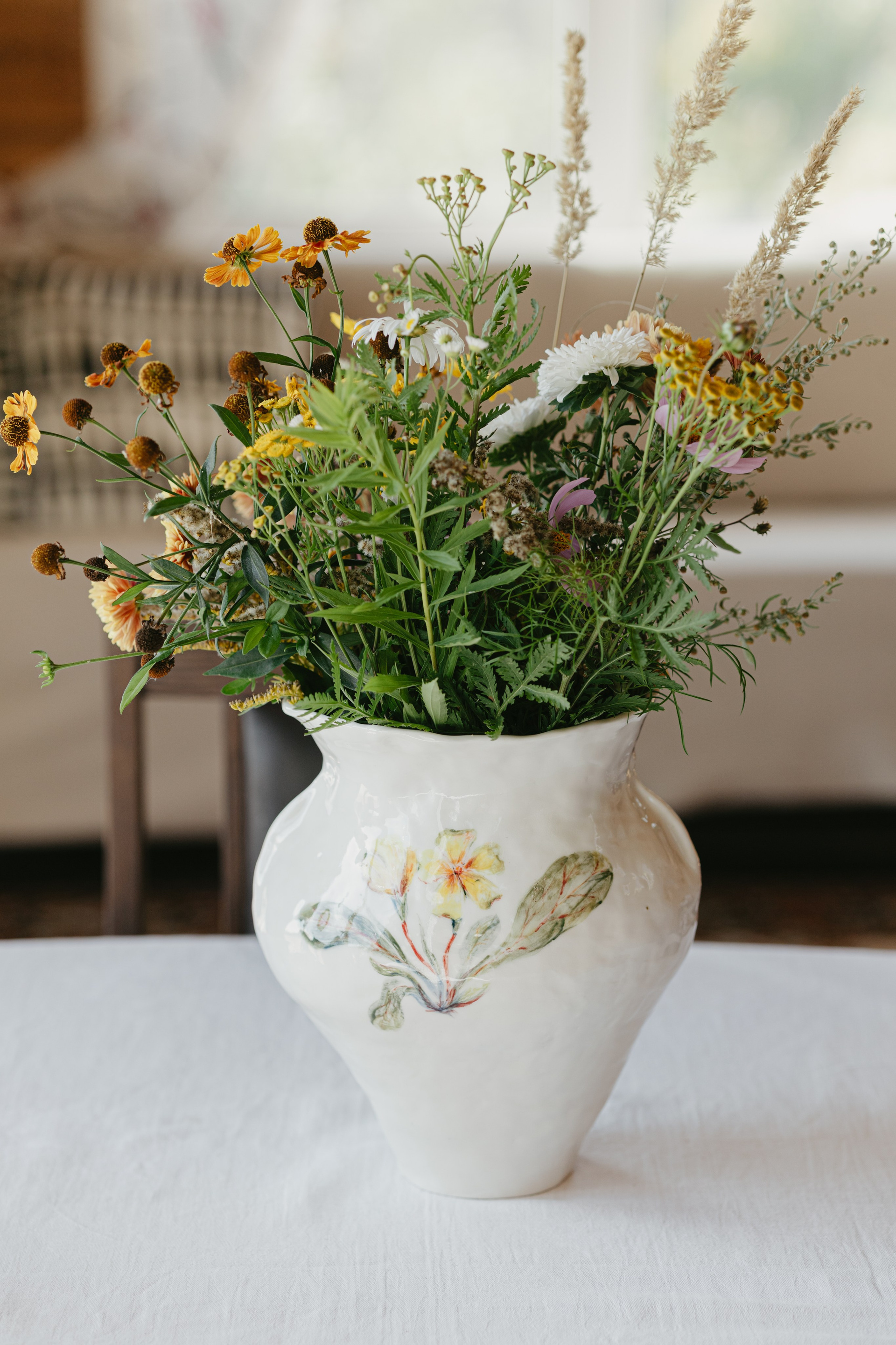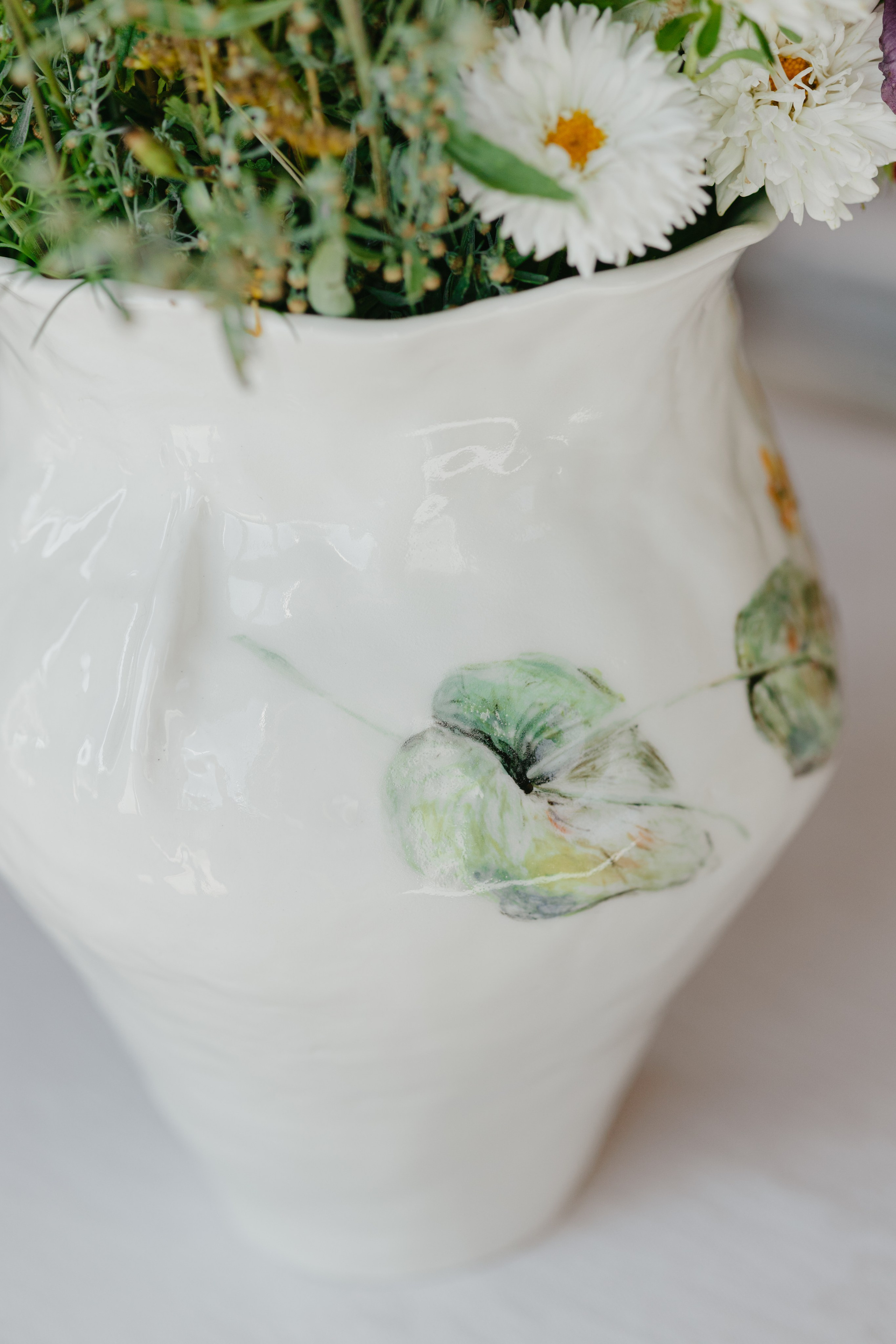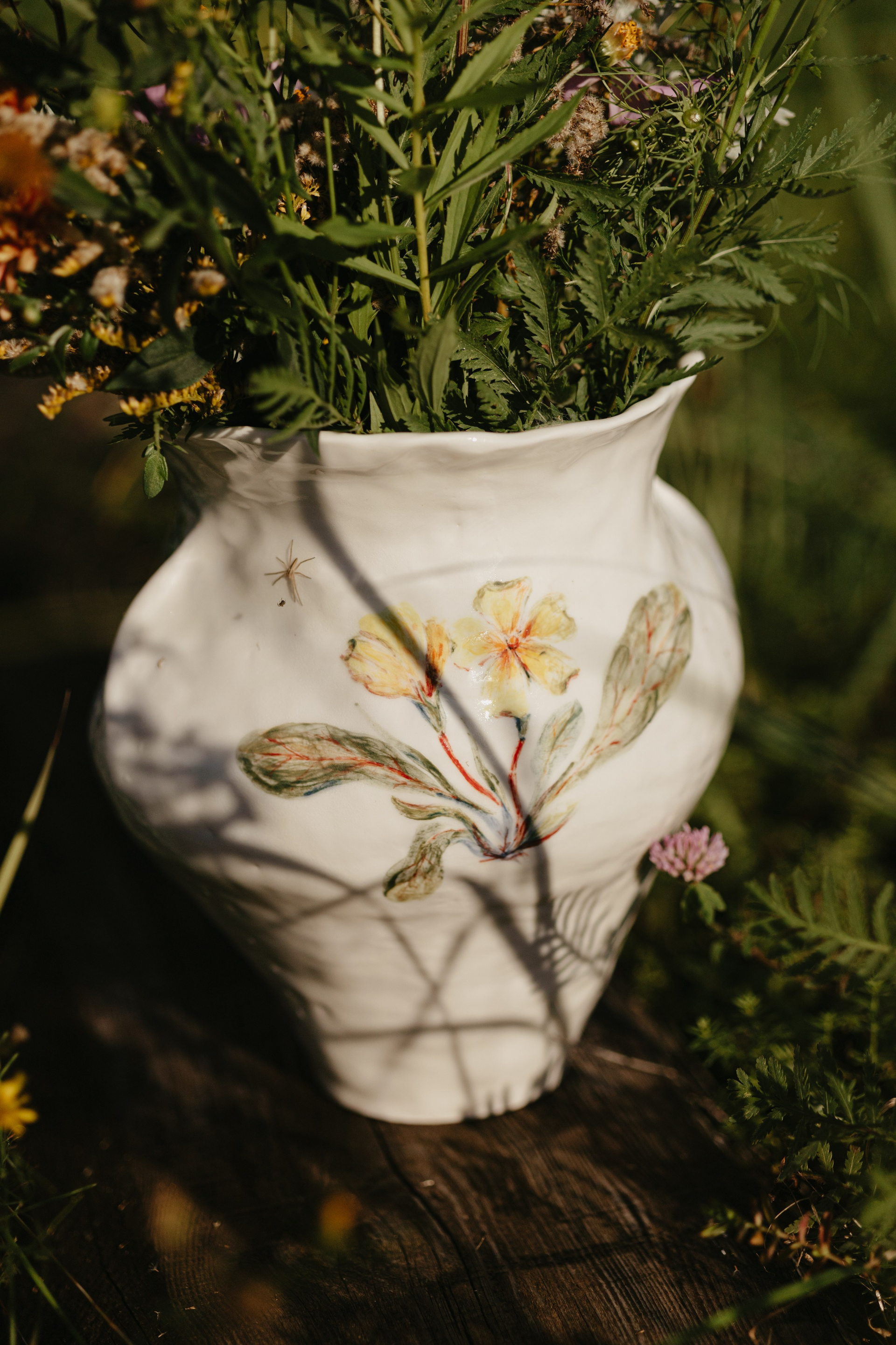 Водонепроницаемая, белая глина, высокий обжиг. Покрыта прозрачной глазурью. Ручная лепка и ручная роспись. Эта ваза самая первая из коллекции ваз, расписанных полевыми цветами. Какие прекрасные букеты можно в неё собирать.