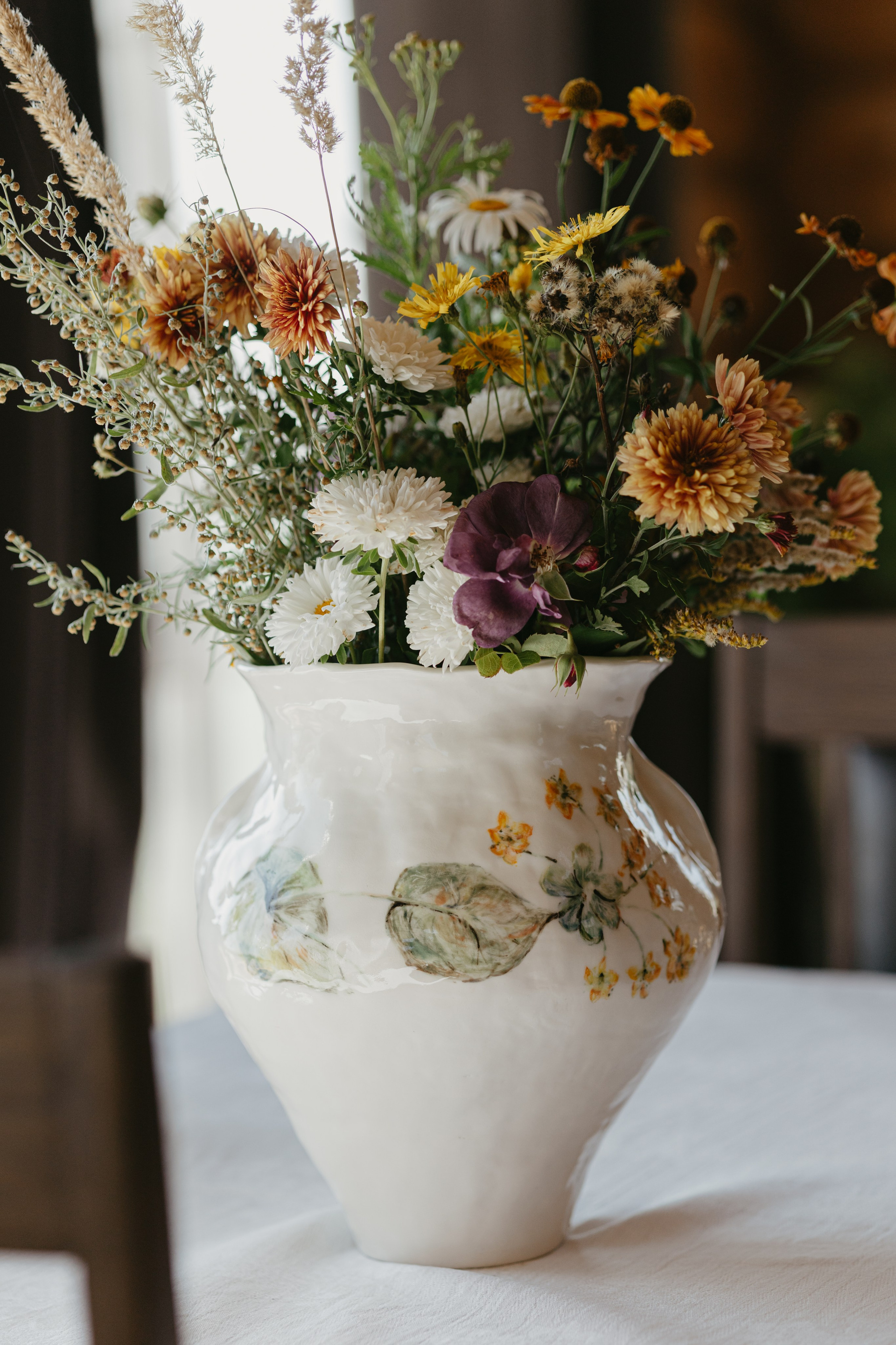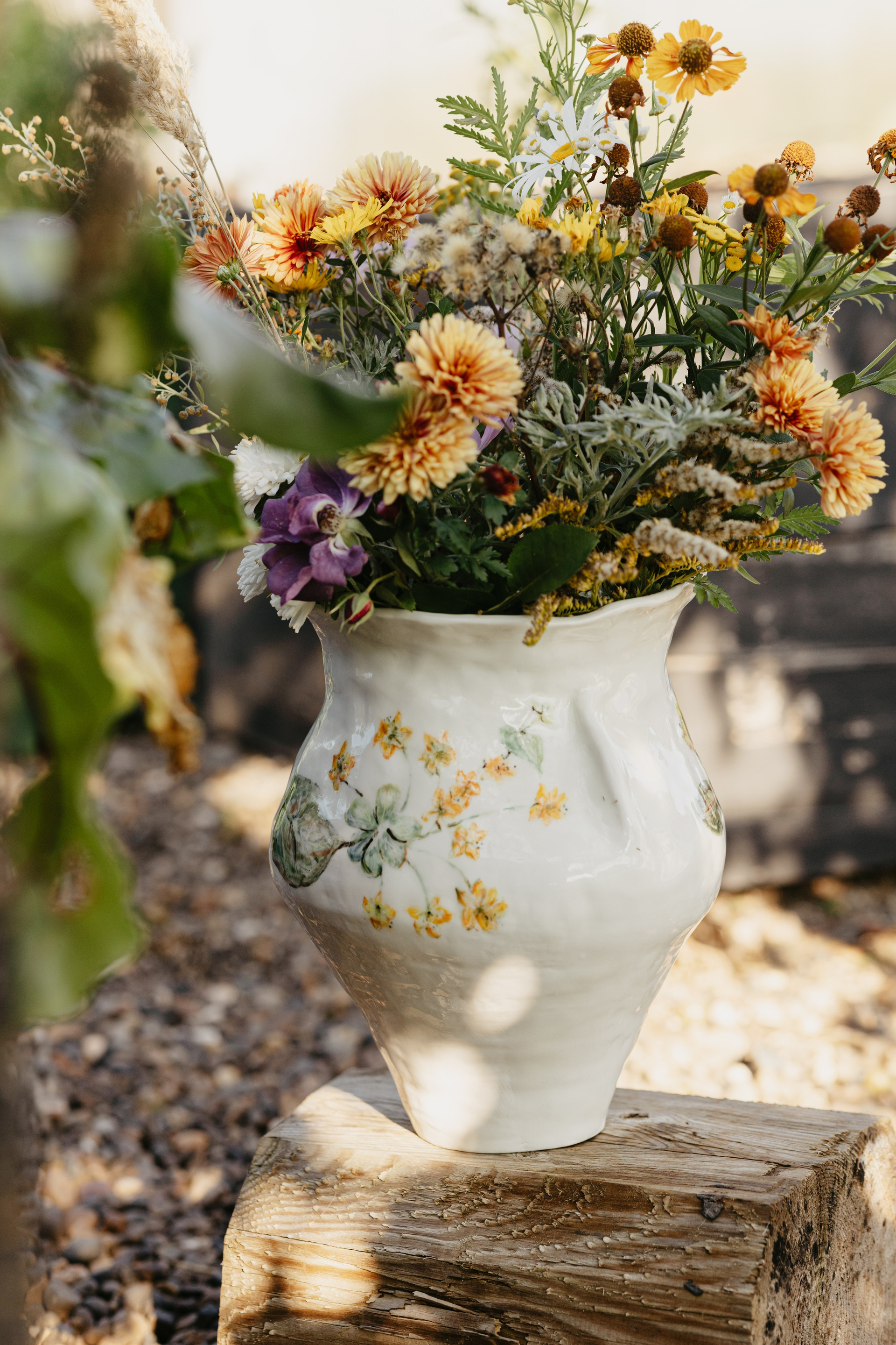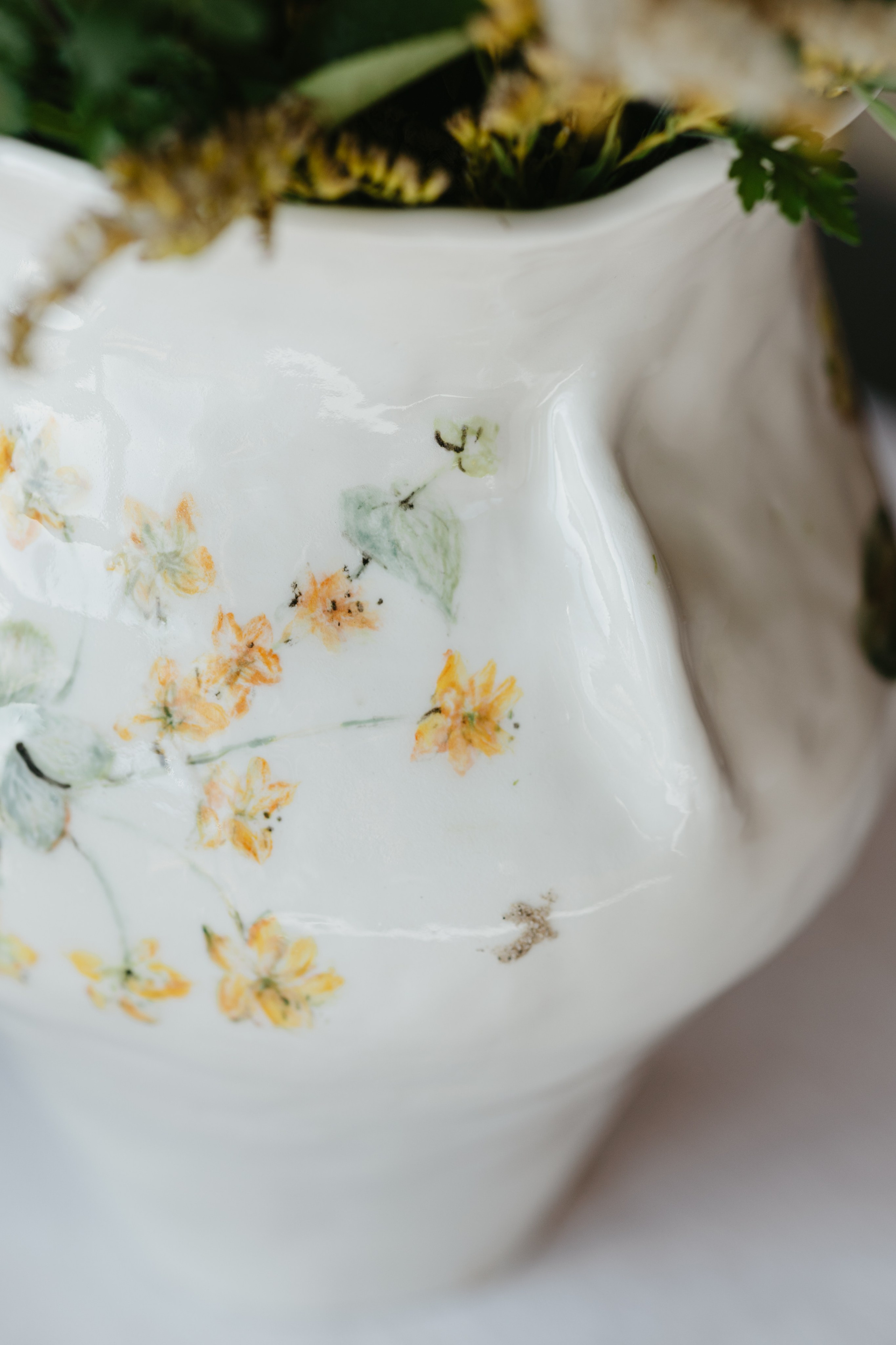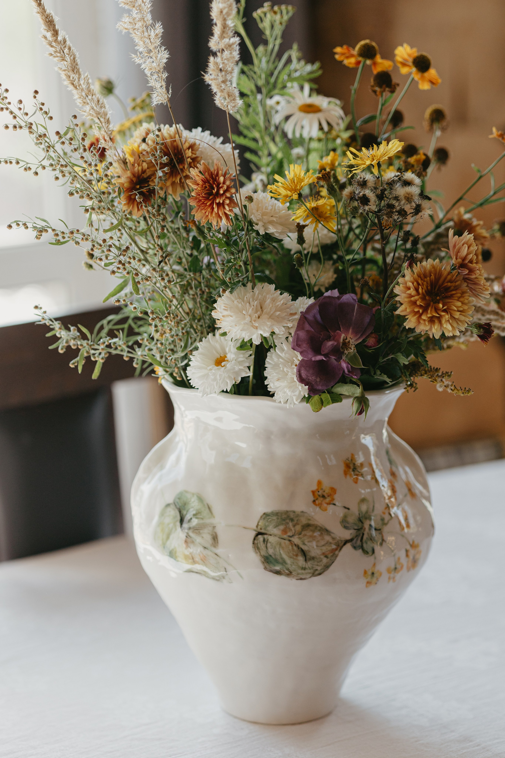 Водонепроницаемая, белая глина, высокий обжиг. Покрыта прозрачной глазурью. Ручная лепка и ручная роспись. Эта ваза самая первая из коллекции ваз, расписанных полевыми цветами. Какие прекрасные букеты можно в неё собирать.