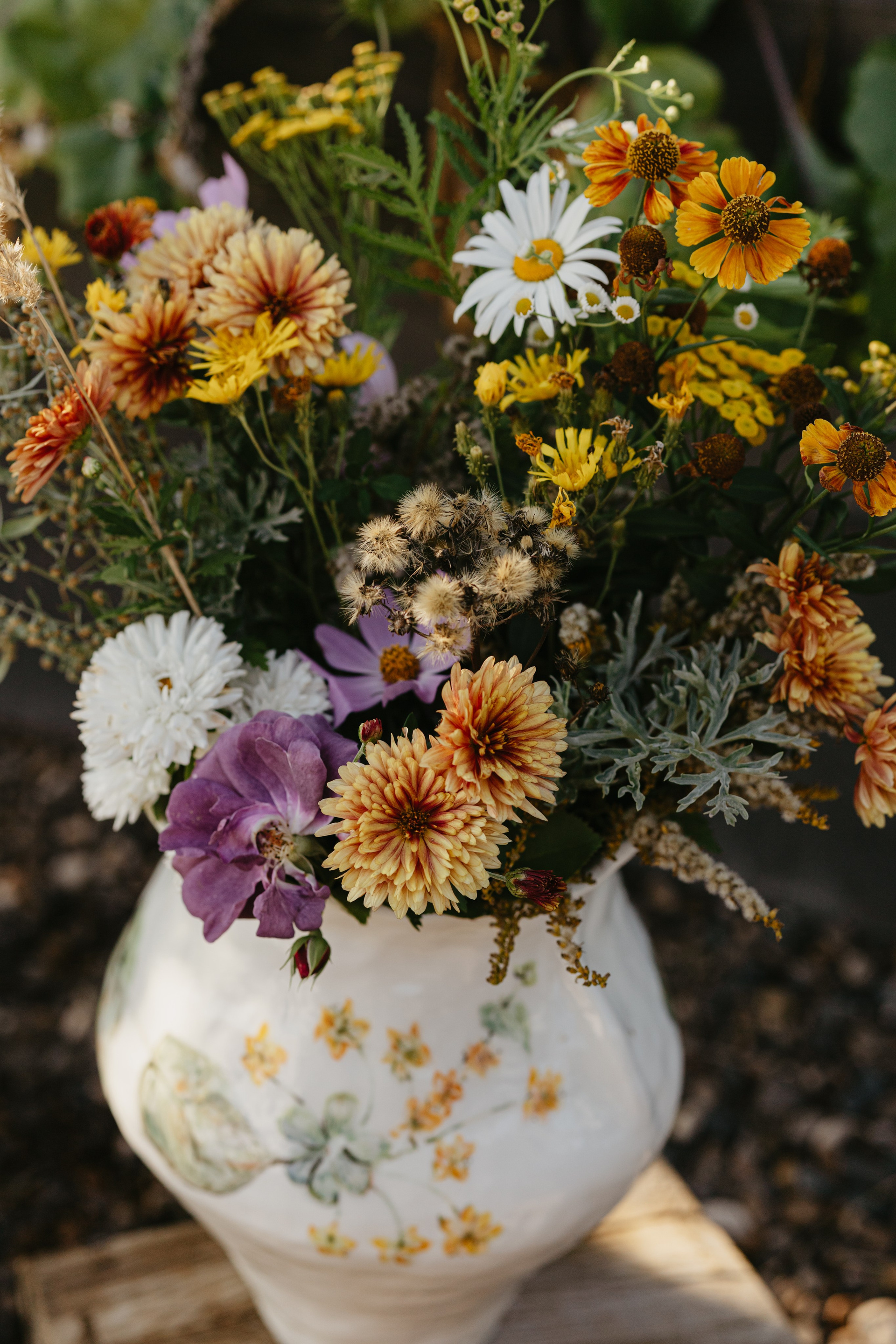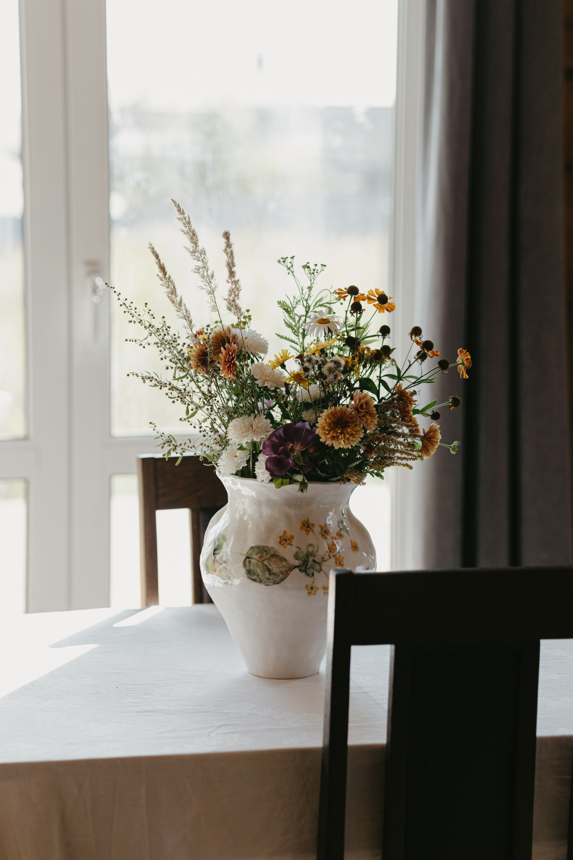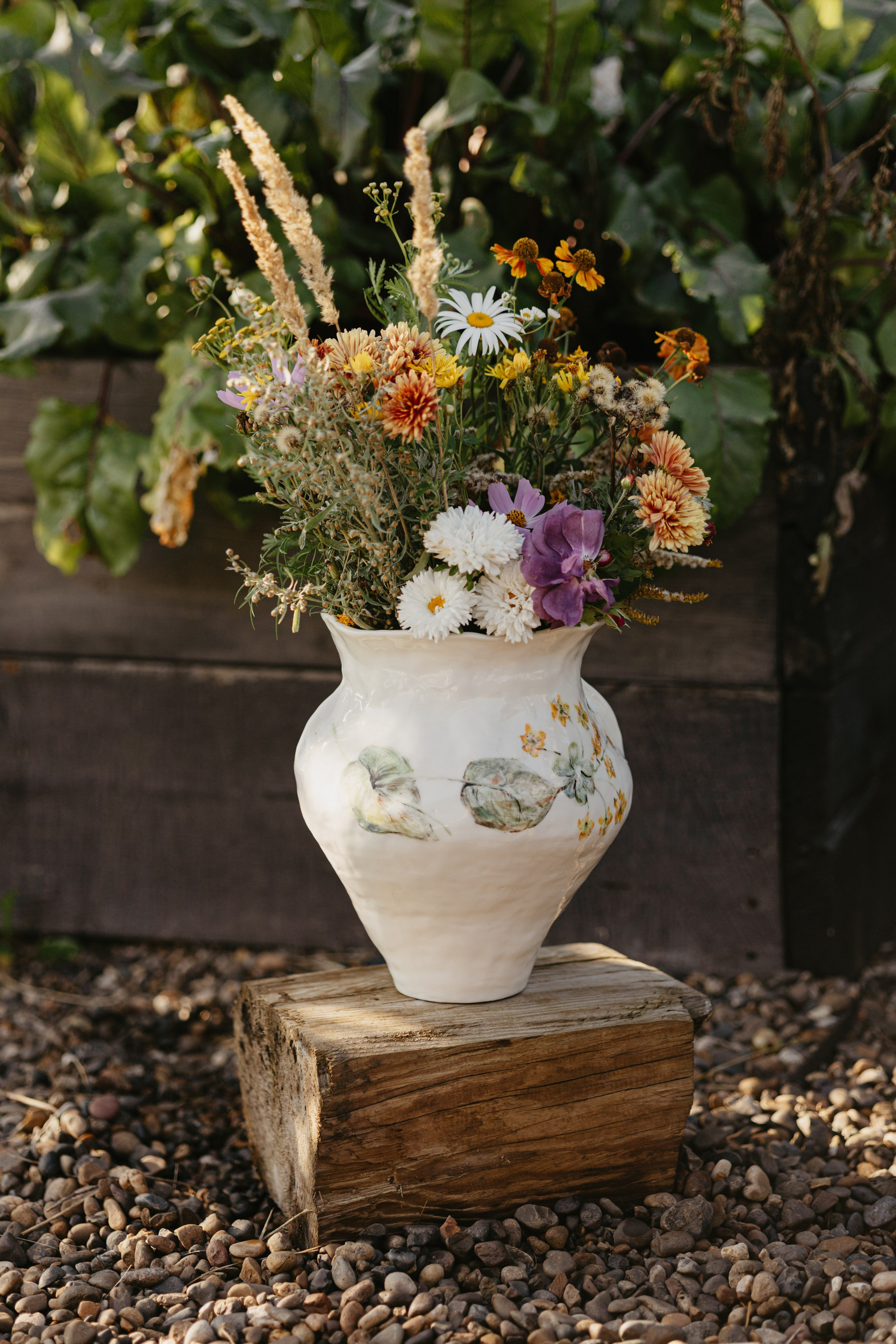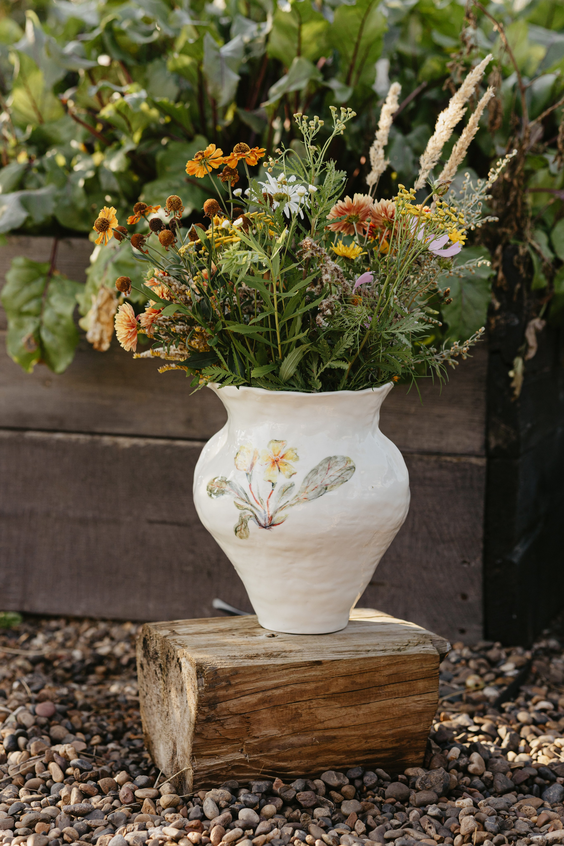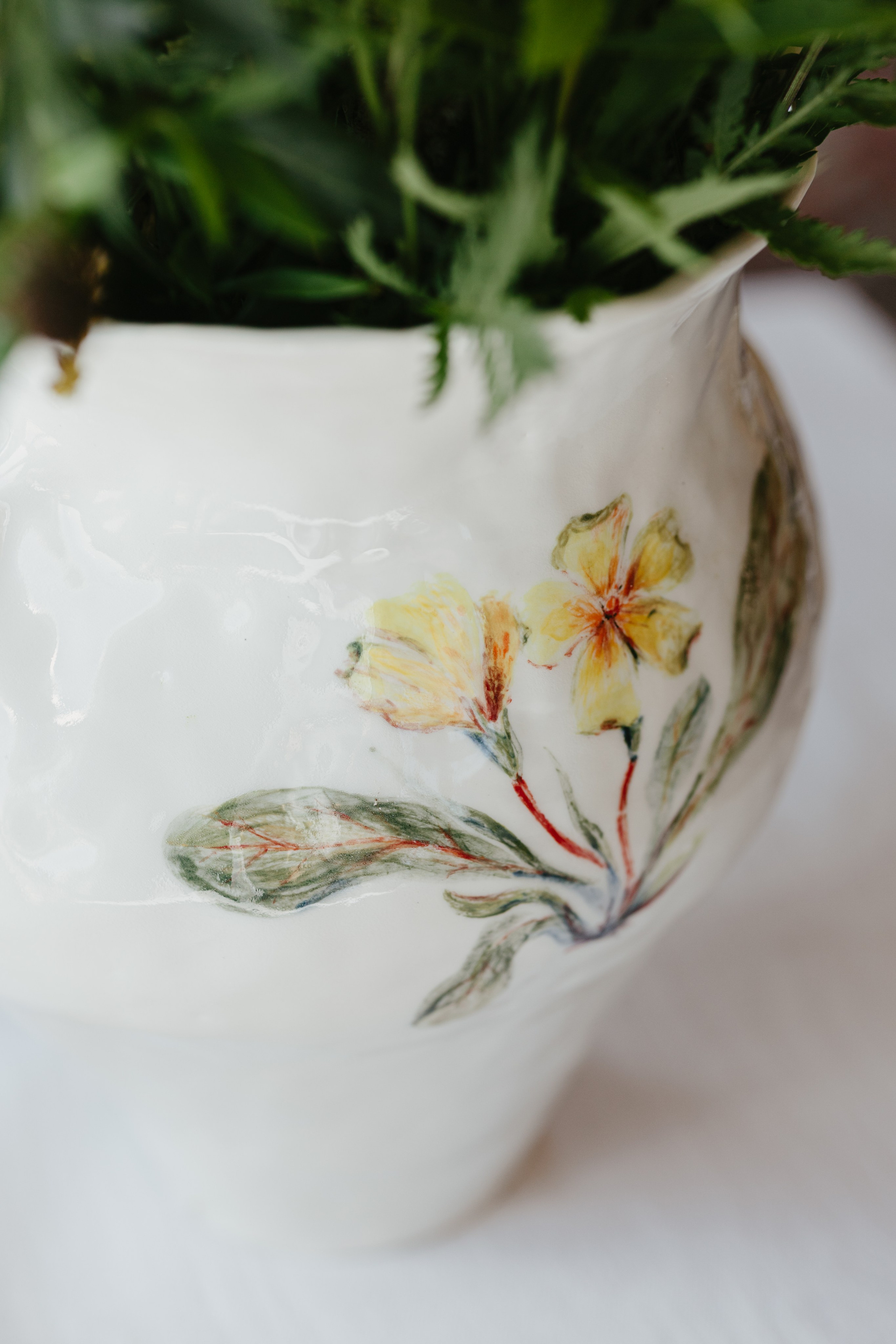 Водонепроницаемая, белая глина, высокий обжиг. Покрыта прозрачной глазурью. Ручная лепка и ручная роспись. Эта ваза самая первая из коллекции ваз, расписанных полевыми цветами. Какие прекрасные букеты можно в неё собирать.
