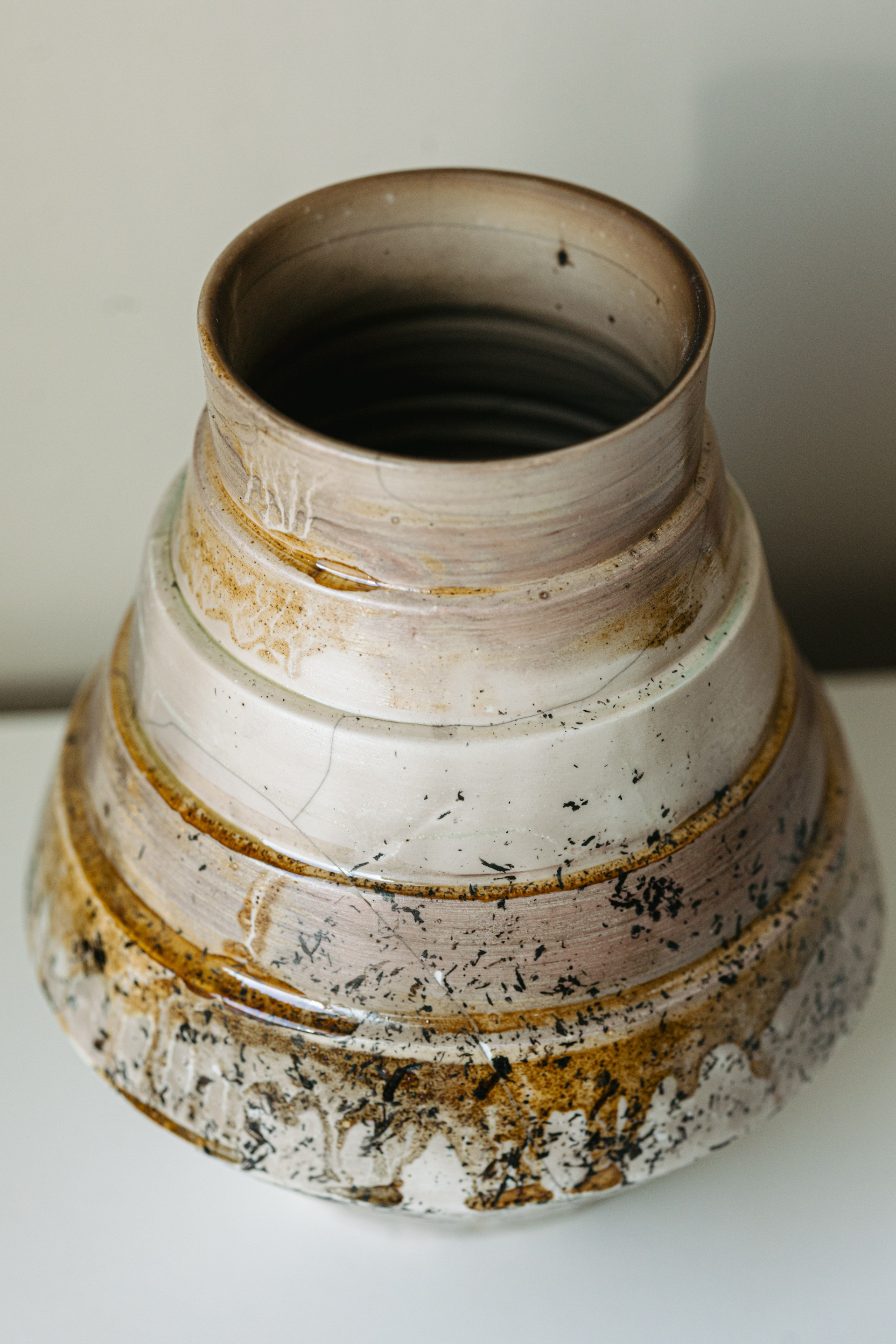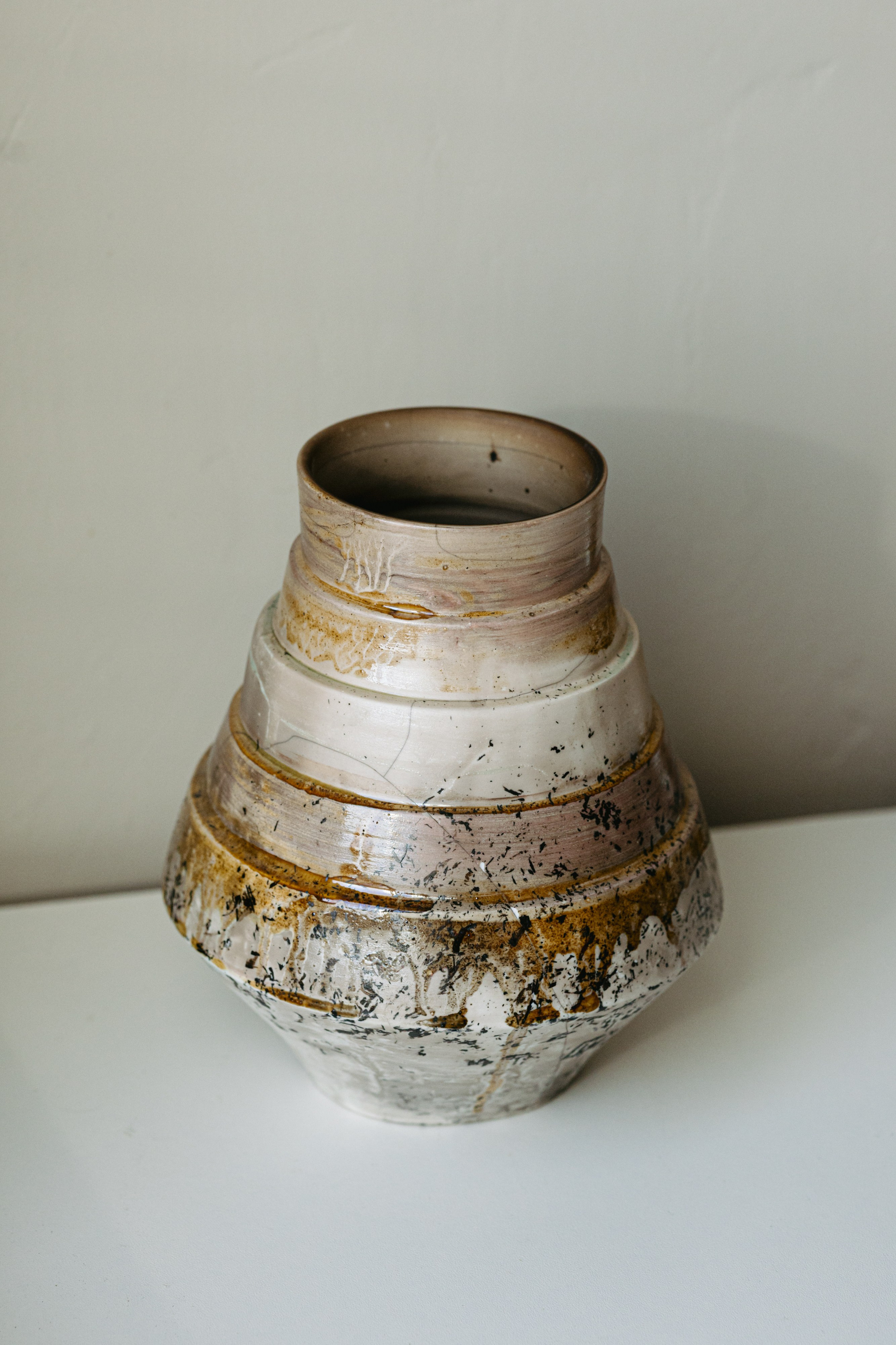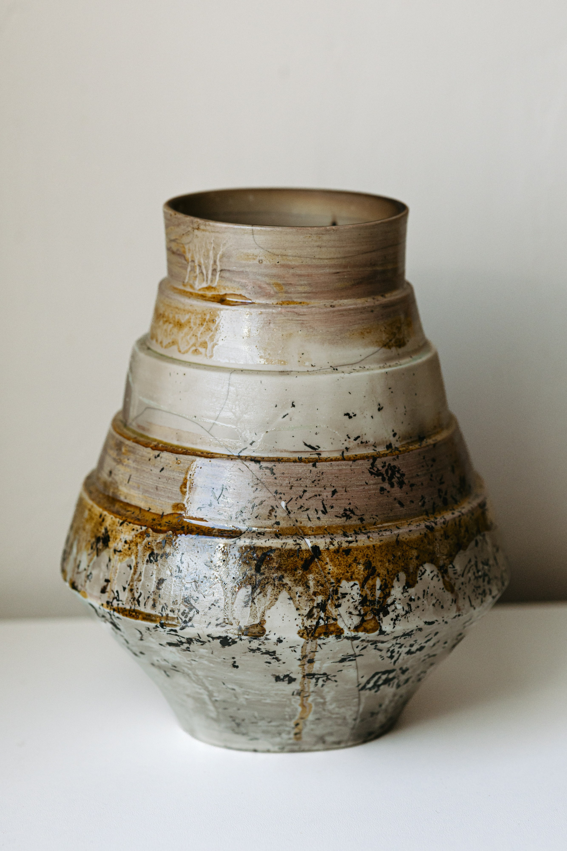 Белая керамическая масса, восстановительный обжиг Раку.Очень декоративная ваза, с трещинами, природным влиянием, восстановленными металлами, дымлением. Для того, чтобы использовать её с цветами, можно поместить внутрь любую водонепроницаемую тару.